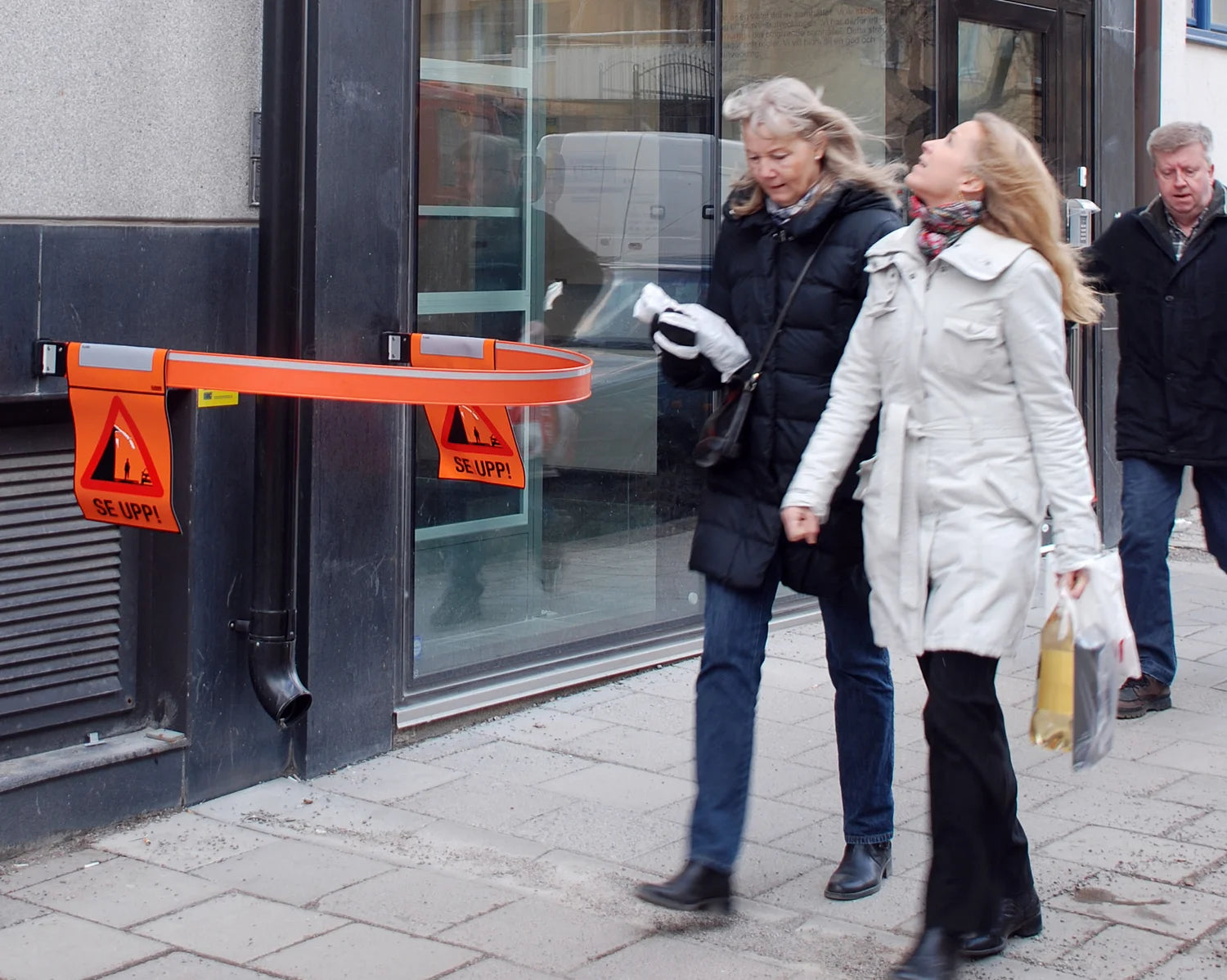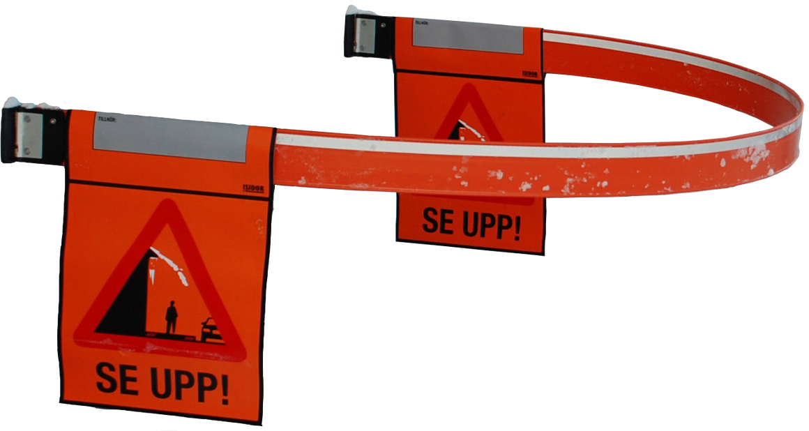 Lange, flexible Thermoplastschranke, die deutlich vor Schnee- und Eisabstürzen warnt und Fußgänger sicher am Gefahrenbereich vorbeiführt, ohne abzusperren.