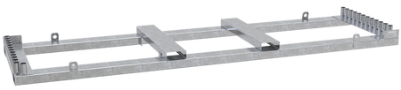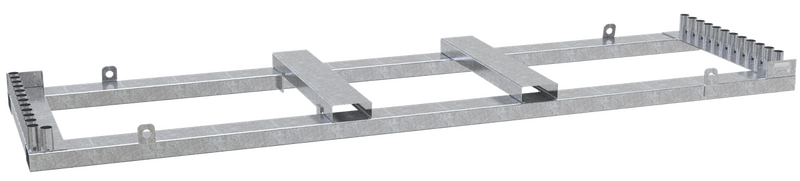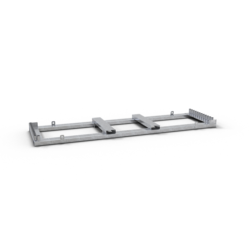 Robuste, feuerverzinkte Stahlpalette, entworfen für die sichere Lagerung und den Transport von bis zu 25 mobilen Zaunfeldern. Geeignet für den Umgang mit Gabelstaplern und das Heben mit Kränen.