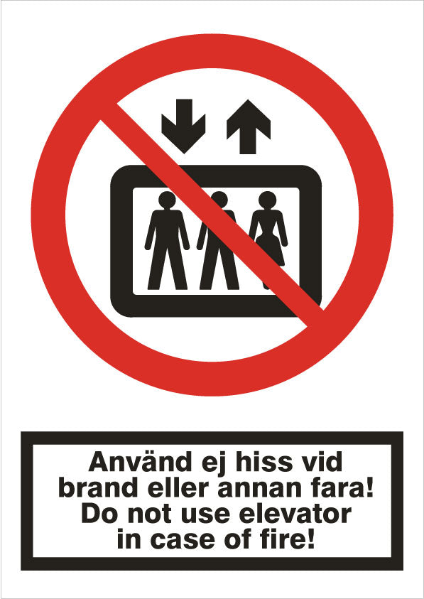 Förbudsskylt. Användning av hiss vid brand eller annan fara förbjuden
